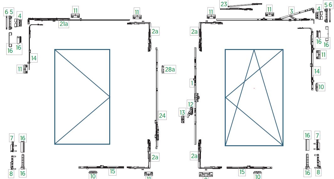 En esta categoría puedes encontrar herrajes para varios tipos de ventanas y puertas. Herrajes que suministramos se usa con perfiles de PVC, perfiles de Aluminio con Canal 16 y también con madera. Los sistemas que puedes encontrar en nuestra gama de productos son: - Herrajes Oscilobatiente para Ventanas y Puertas de PVC, Aluminio Canal 16 y Madera - Herrajes Oscilobatiente con Bulón de Seguridad para Ventanas y Puertas de PVC, Aluminio Canal 16 y Madera - Herrajes Oscilobatiente de 2 hojas para Ventanas y Puertas de PVC, Aluminio Canal 16 y Madera - Herrajes Oscilobatiente de 2 hojas con Bulón de Seguridad para Ventanas y Puertas de PVC, Aluminio Canal 16 y Madera - Herrajes Practicable de 2 hojas para Ventanas y Puertas de PVC, Aluminio Canal 16 y Madera - Herrajes Oscilobatiente Inclinada para Ventanas y Puertas de PVC, Aluminio Canal 16 y Madera - Herrajes Plegable para Ventanas y Puertas de PVC, Aluminio Canal 16 y Madera - Herrajes Oscilo Paralela para Ventanas y Puertas de PVC y Aluminio Canal 16 - Herrajes Oscilo Paralela de 2 hojas para Ventanas y Puertas de PVC y Aluminio Canal 16 - Herrajes Practicable para Ventanas y Puertas de PVC y Aluminio Canal 16 - Herrajes Oscilobatiente Oscilo Primero para Ventanas y Puertas de PVC, Aluminio Canal 16 y Madera - Herrajes Proyectantes para Ventanas y Puertas de PVC, Aluminio Canal 16 y Madera